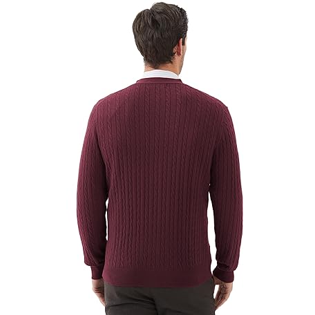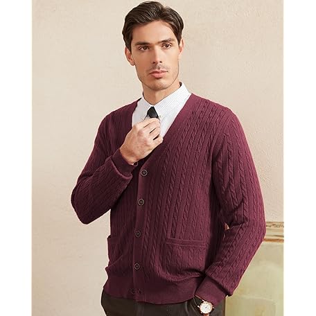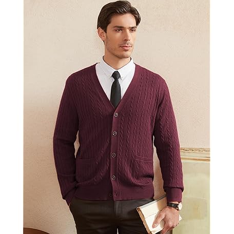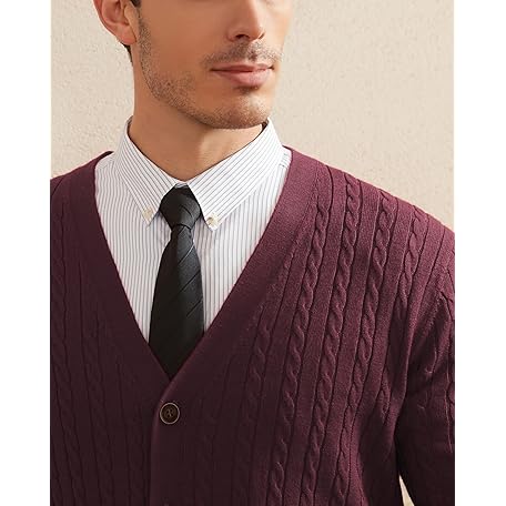 • Kallspin Men's Cardigan Sweater Wool Blend Cable Knit V Neck Buttons Cardigan with Pockets