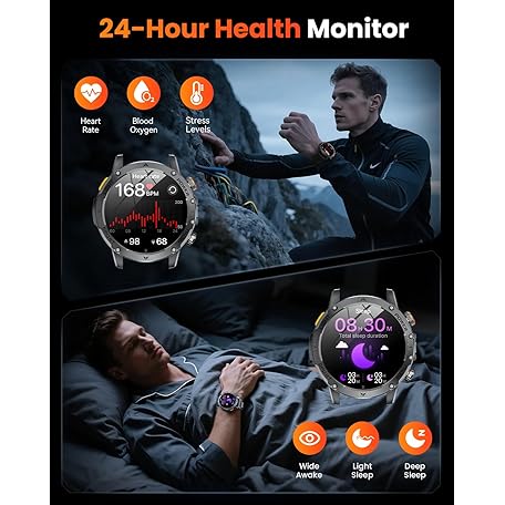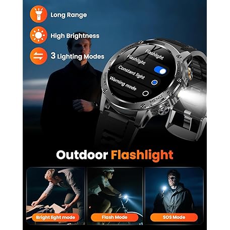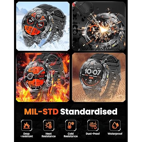 Thông tin sản phẩm Karchilor Military Smart Watches for Men, 1.7″ Smart Watch with 1000 mAh Battery, Led Flashlight, Answer/Make Calls, IP68 Waterproof, Heart Rate/Sleep Monitor 100+ Sport Modes Fitness Watch for Android/iPhone