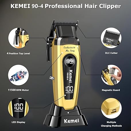 KEMEI 90-4 Professional Hair Clippers for Men, 11500 RPM Barber Clippers with LED Display, Cordless Hair Trimmer with DLC Blade & Charging Base, 2000 mAh Hair Clipper for Barbers Haircut Kit