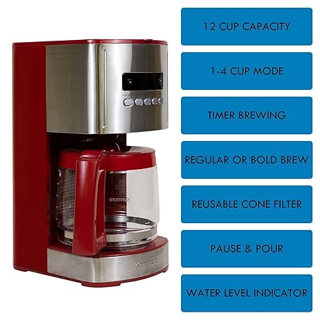 Thông tin sản phẩm Kenmore Drip Coffee Maker - 12 Cup Programmable Cafe Machine With Glass Pot, Regular & Bold Brew, Auto Shut Off Large Water Reservoir, Reusable Filter, Kitchen Appliances For Cafeteria Barista, Red