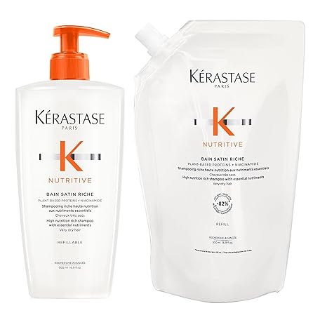 Kerastase Nutritive Bain Satin Riche Shampoo & Refill Pouch - Revitalizes & Strengthens Very Dry Hair, Restores Shine, For Very Dry Hair, 16.9 Fl Oz