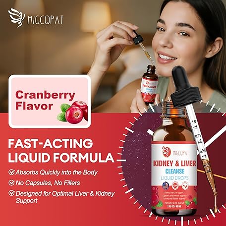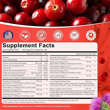 Thông tin sản phẩm Kidney and Liver Cleanse Detox & Repair Drops, Cranberry and Milk Thistle Supplement with Artichoke, Astragalus, Horsetail – Natural Herbal for Liver, Kidney, Urinary Tract, Bladder, 60ml