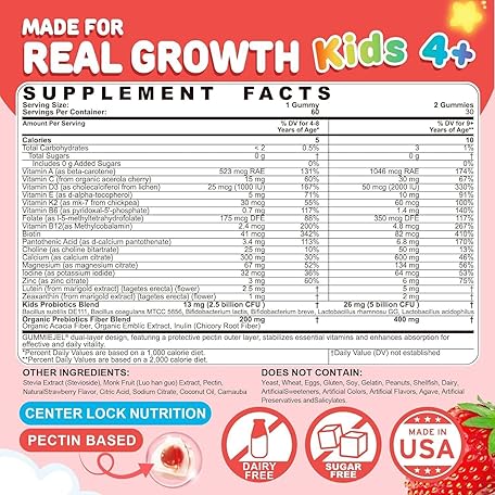 Thông tin sản phẩm Kids Multivitamin Gummies + Calcium, Probiotics, Vitamin D3, C, Methylated B12 & Methylfolate, B6, A, K2, E, Zinc, Prebiotics for Children Ages 4+, Clean & Sugar Free, for Nutritional Support, 60 Cts