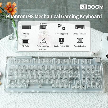 Thông tin sản phẩm KiiBoom Phantom 98 Hot Swappable Crystal Gasket-Mounted Mechanical Keyboard, Triple Mode NKRO Gaming Keyboard with South-Facing RGB, Clear Keycaps, 8000mAh Battery for Win/Mac (Clear)