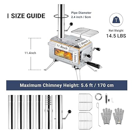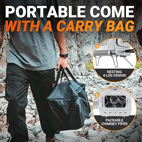 KingCamp Hot Tent Stove, Foldable Camping Stove with Large Firebox, 5.6ft Winter Camping Stove for Tent, Shelter, Cabin Heating, With Chimney Pipes, Heat Resistant Glass & Gloves for Outdoor