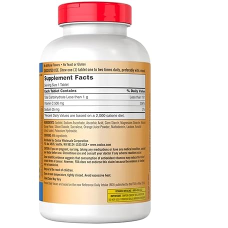 Sản phẩm Kirkland Signature Chewable Vitamin C 500 Mg Tangy Orange Taste: 500 Tablets đang được bán với giá ưu đãi là $19.6091 tại nước Mỹ.