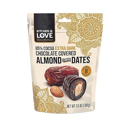 Sản phẩm Kitchen & Love Chocolate Covered Almond Stuffed Dates in a Convenient Resealable Pouch, 8 Individually Wrapped Pieces, 85% Extra Dark Chocolate, Healthy Snack, 3.5 oz, Pack of 1 đang được bán với giá ưu đãi là $9.1342 tại nước Mỹ.