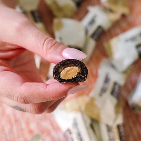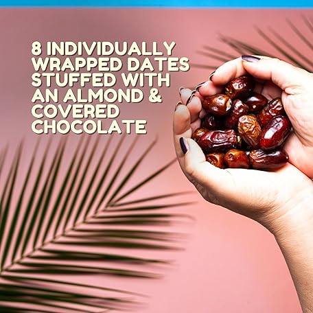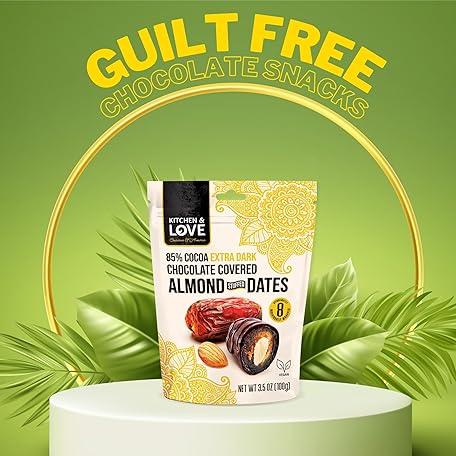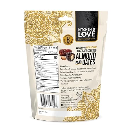 Thông tin sản phẩm Kitchen & Love Chocolate Covered Almond Stuffed Dates in a Convenient Resealable Pouch, 8 Individually Wrapped Pieces, 85% Extra Dark Chocolate, Healthy Snack, 3.5 oz pouch (Pack of 4)