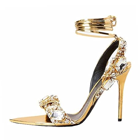 • Kluolandi Women's Strappy Stiletto Heels with Crystal Lace Up Gladiator Sexy Open Toe High Heeled Sandals Gold Heels for Women