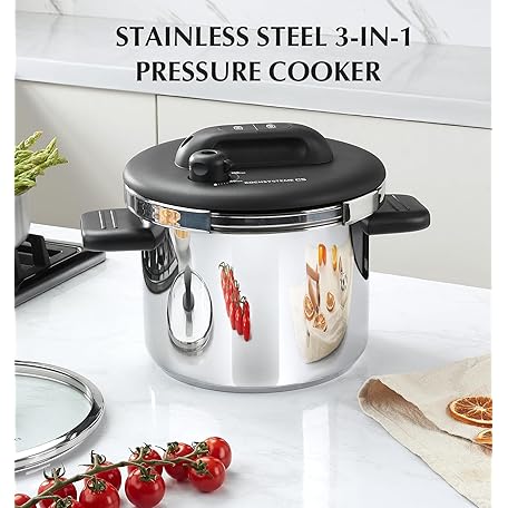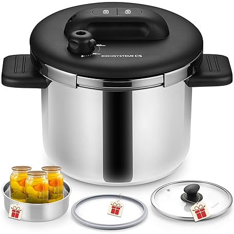 Thông tin sản phẩm KOCH SYSTEME CS Pressure Cooker Stainless Steel, 6.3 QT Olla de Presion, Easy One-Press Lock, 3 PSI Settings Pressure Cooker, Save 70% Time, Gas & Induction Compatible, Glass Lid & Steamer Rack