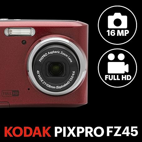 Thương hiệu KODAK là cái tên nổi tiếng được rất nhiều khách hàng trên thế giới chọn lựa. Với kiểu dáng đẹp mắt, sang trọng, sản phẩm KODAK PIXPRO Friendly Zoom FZ45-RD 16MP Digital Camera with 4X Optical Zoom 27mm Wide Angle and 2.7" LCD Screen (Red)  là sự lựa chọn hoàn hảo nếu bạn đang tìm mua một món  cho riêng mình.