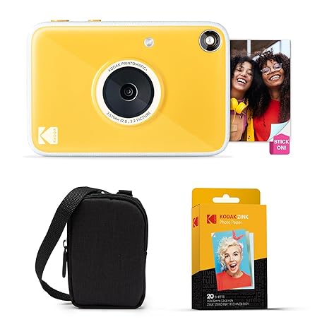 Kodak Printomatic+ Instant Print Digital Camera Starter Bundle + Carrying Case + Zink 20pk Sticky-Back Photo Paper - 10MP, Full-Color Photos, GB LED Status Indicator - Yellow