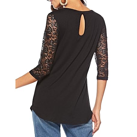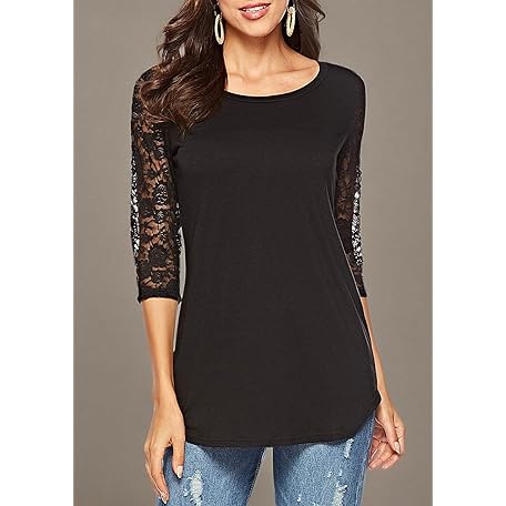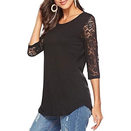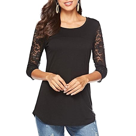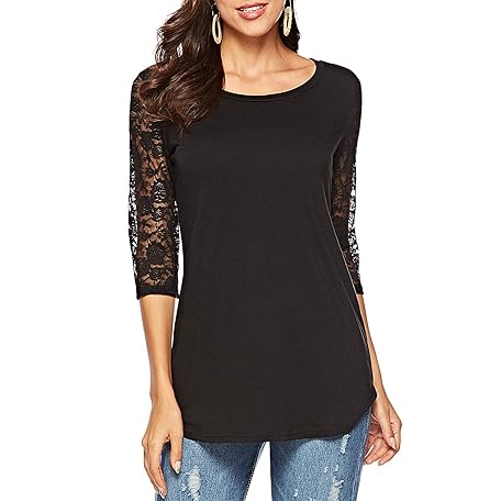 • koitmy Women's 3/4 Lace Sleeve Round Neck T-Shirt Casual Blouses Tunics Tops