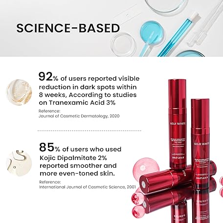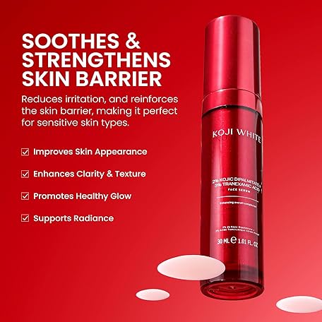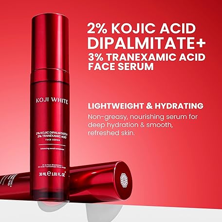 • Koji White 2% Kojic Acid Serum + 3% Tranexamic Acid, 5% Niacinamide | Hydrating Facial Soothing Moisturizer for Uneven Skin - Vegan Skin Care, Fragrance Free, Unscented for Sensitive Skin - 1.01 Fl Oz
