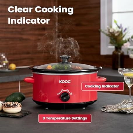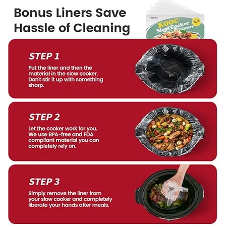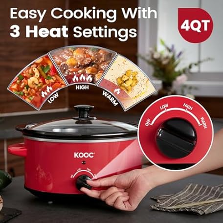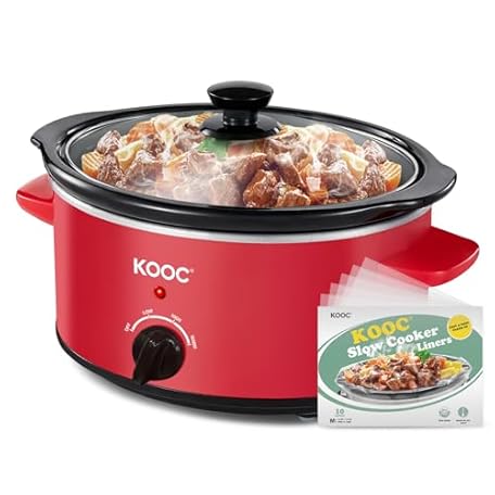 KOOC 4-Quart Slow Cooker, 3 Cooking Settings, Dishwasher Safe Ceramic Crock, Lid, Free Pot Liners Included, RED, Ellipse Pot