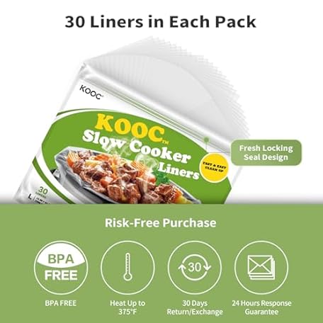 Thương hiệu KOOC là cái tên nổi tiếng được rất nhiều khách hàng trên thế giới chọn lựa. Với kiểu dáng đẹp mắt, sang trọng, sản phẩm KOOC Slow Cooker Liners 13"x21" 30 Count Disposable Plastic Bags Pot Liners Cooking Bags Fit 3 qt to 8.5 qt Pot BPA Free là sự lựa chọn hoàn hảo nếu bạn đang tìm mua một món cho riêng mình.