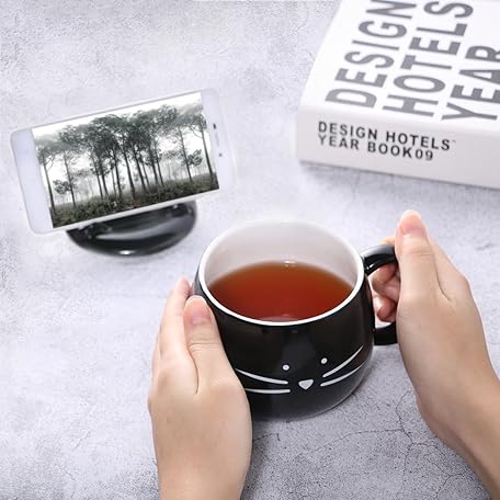 Thông tin sản phẩm Koolkatkoo Ceramic Cat Mug - Black Ceramic Coffee Cup, Coffee Mug with Lid and Spoon, Cute Kitty Design with Phone Holder, Gifts for Women Cat Lovers