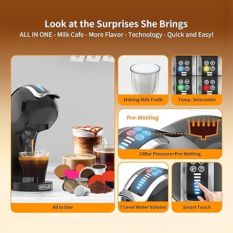 Thông tin sản phẩm KOTLIE Espresso 5in1 Single Serve Coffee Maker, 19Bar Cappuccino&Latte Maker, Cold&Hot Brewing Coffee Machine for K*cup/NES*presso Original/D*olce G*usto/Ground Coffee/44mm ESE(Black)