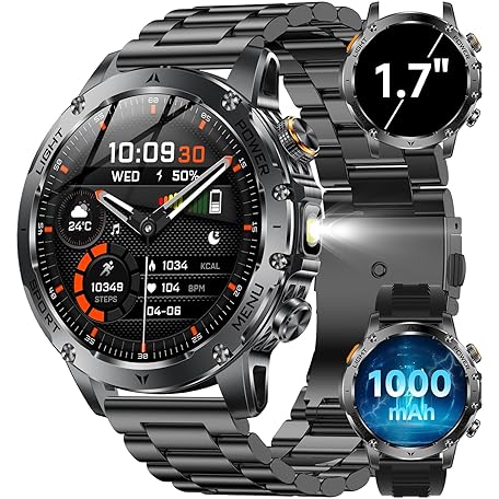 KPEP Military Smart Watches for Men, 1000mAh Battery/LED Flashlight/2 Straps/IP67 Waterproof Smartwatch, Stress/Blood Oxygen/Heart Rate/Sleep Monitor, Reminder, Fitness Tracker for iOS Android, Black