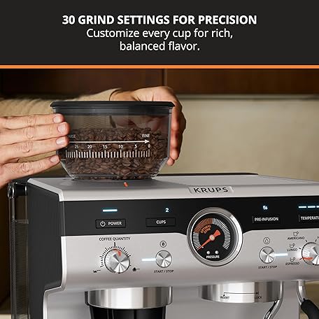 Thông tin sản phẩm KRUPS Precision Espresso Coffee Machine with Grinder, Latte & Cappuccino Maker, Pump Pressure + Milk Frother Steam Wand, Adjustable Grind Settings for Barista-Quality Results, Stainless Steel & Black