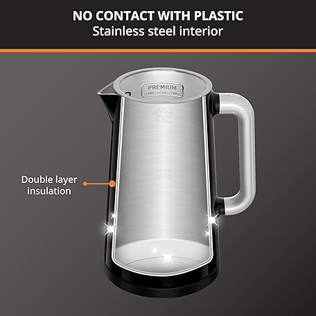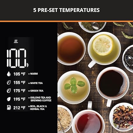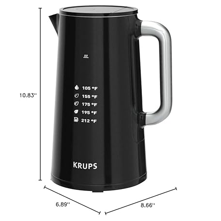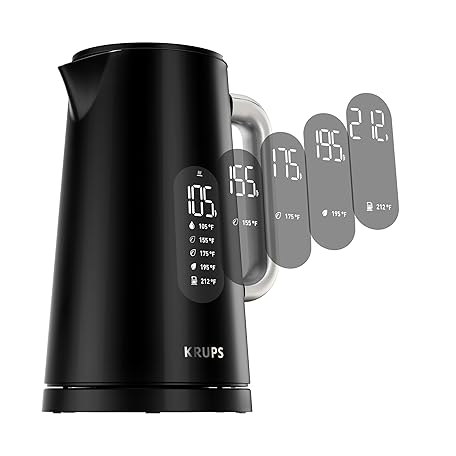 Thông tin sản phẩm KRUPS Smart Temp Electric Kettle: 1.7L Capacity, 5 Precise Temperature Settings, Digital Display, Cool-Touch Exterior, Cordless Design for Tea and Coffee Lovers
