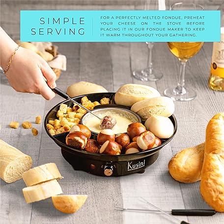 Thông tin sản phẩm Kusini Electric Fondue Pot Set - Chocolate Fondue Kit - Temperature Control, Detachable Serving Trays, & 4 Roasting Forks - Gift Set & Date Night Idea. Serve at Movie Night or Game Night.