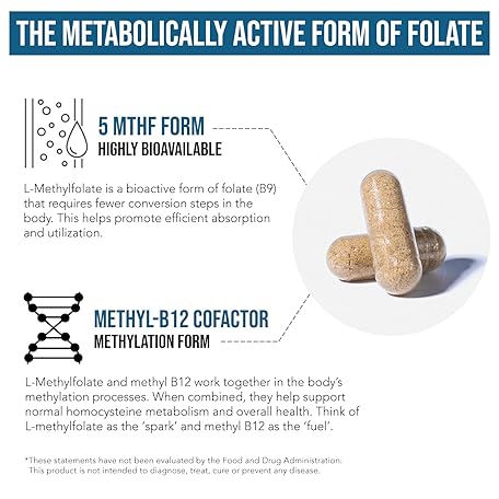 Thông tin sản phẩm L Methyl Folate 1000 mcg Plus Methyl B12 Cofactor – Active 5-MTHF Form - Supports Mood, Methylation, Cognition – Highly Bioavailable Bioactive Forms of Vitamin B9 & B12 (60 Capsules – 60 Servings)