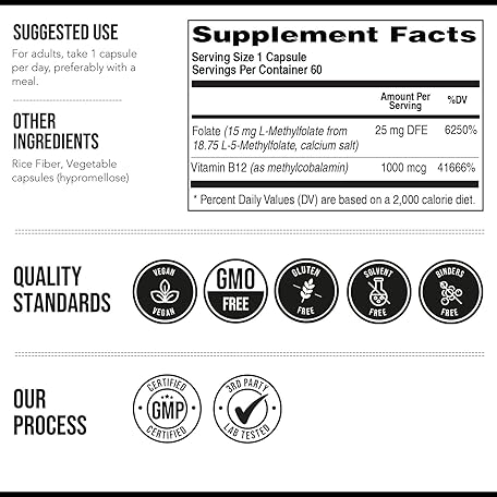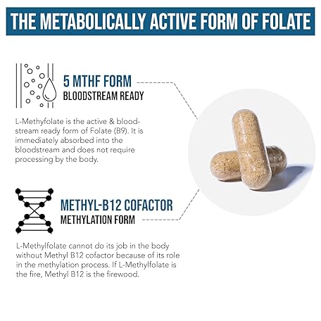 Thông tin sản phẩm L Methyl Folate 15mg Plus Methyl B12 Cofactor – High Potency, Active 5-MTHF Form - Supports Mood, Methylation, Cognition – Bioactive Forms of Vitamin B9 & B12 (60 Capsules – 60 Servings)