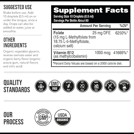 Thông tin sản phẩm L Methyl Folate 15mg Plus Methyl B12 Cofactor – Organic Berry Flavor, High Potency Liquid Sublingual Active 5-MTHF Form - Supports Mood, Methylation, Cognition – Bioactive Forms Vitamin B9 & B12 (1oz)