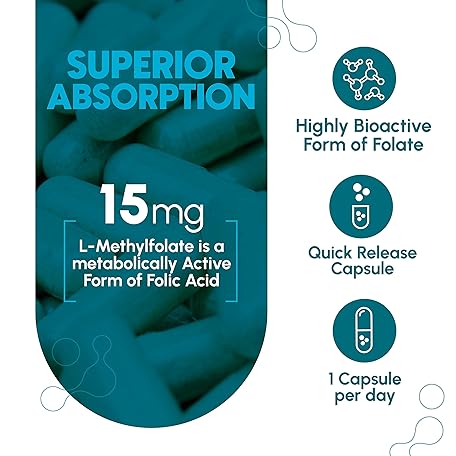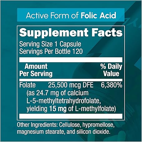Thông tin sản phẩm L-Methylfolate 15mg - L Methyl Folate Supplement, 5-MTHF for Folic Acid Deficiency - Max Absorption and Potency - l-methylfolate 15 mg - Methyl folate 15 mg - 120 Vegan Capsules, Non-GMO Gluten Free