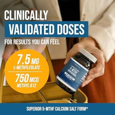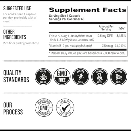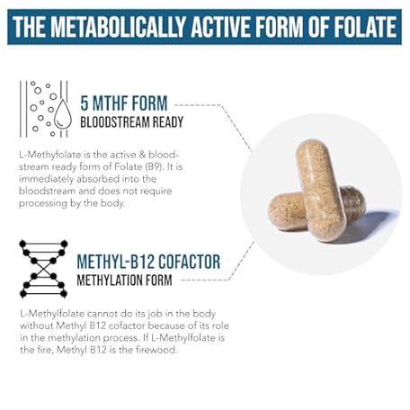 Thông tin sản phẩm L Methylfolate 7.5mg plus Methyl B12 - Active 5-MTHF Form, MTHFR Supplement - Bloodstream Ready Methylated Folate + B12 Cofactor - Supports Mood, Homocysteine Methylation, Cognition (60 Capsules)