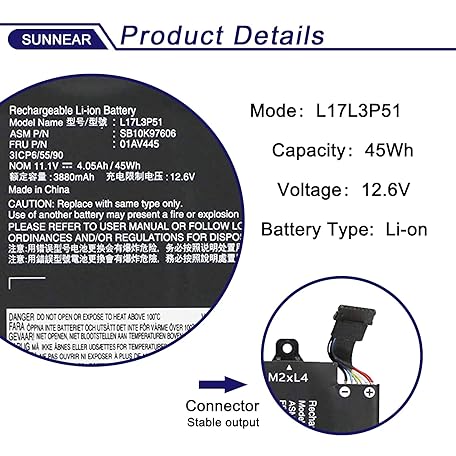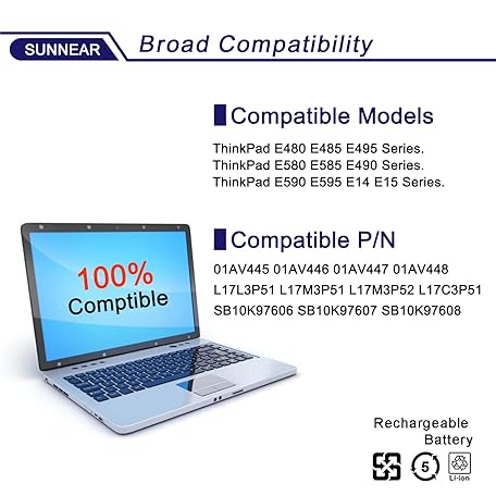 Thương hiệu SUNNEAR là cái tên nổi tiếng được rất nhiều khách hàng trên thế giới chọn lựa. Với kiểu dáng đẹp mắt, sang trọng, sản phẩm L17L3P51 01AV445 Battery Compatible with Lenovo ThinkPad E480 E490 E485 E495 E580 E585 E590 E595 E14 E15 Series SB10K97606 SB10K97608 01AV447 01AV448 L17C3P51 L17M3P52 SB10K97609 11.1V 45Wh là sự lựa chọn hoàn hảo nếu bạn đang tìm mua một món cho riêng mình.