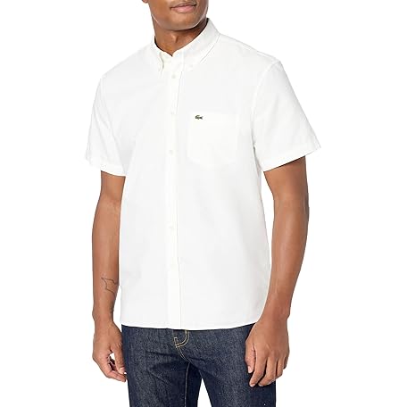 Lacoste Mens Regular Fit Short Sleeve Oxford Collared Button Down Shirt W/Front Chest Pocket, White, Large/X-Large