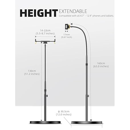 Thông tin sản phẩm Lamicall Tablet Floor Stand Holder - Gooseneck Tablet Mount for Bed, 63" Adjustable Height & 10.6lb Stable Base, for 4.7-13" Tablets, iPad Pro 13/9.7, Air, Mini, Galaxy Tab, Kindle, Phones