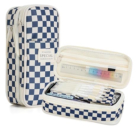 Large Capacity Pencil Case for Teens Girls - Cute Checkerboard Pencil Pouch with Zipper, Stationery Bag Box for Student Back to School Gifts, Blue