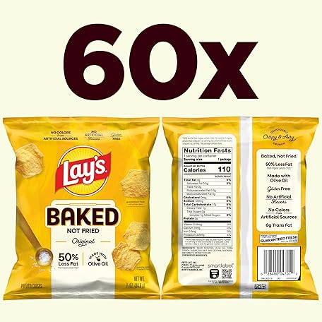 Thông tin sản phẩm Lay's Baked Lay’s Potato Chips, Original, 0.875 oz Bags, (60 Pack), 50% Less Fat, Gluten Free, No Artificial Flavors, No Colors from Artificial Sources