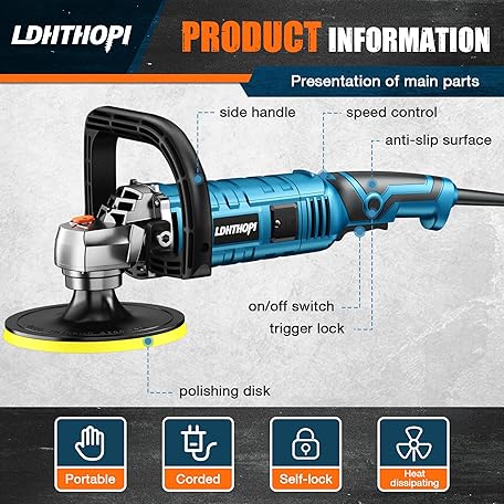 Thông tin sản phẩm LDHTHOPI Buffer Polisher, 1600W 7 Inch/6 Inch Rotary Buffer Polisher Waxer, 7 Variable Speed 1000-3500 RPM, Detachable Handle for Car, Boat Sanding, Polishing, Waxing
