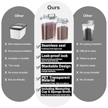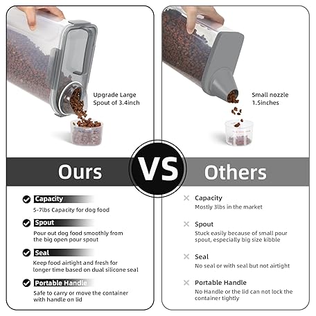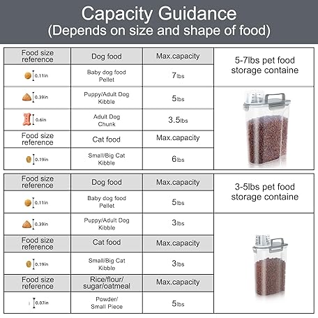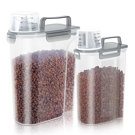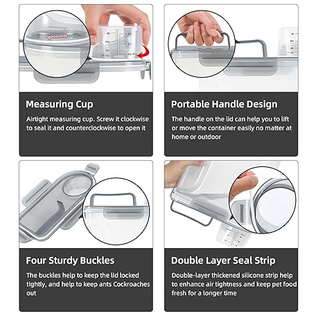 Thông tin sản phẩm LEAWALK (3+5LBS 2Pack Cat Dog Food Storage Container Upgraded Large Nozzle BPA-free, Plastic Pet Food Containers, With 4 Sealed Clasps/1 Measuring Cup/Handle Easy Clean and Carry (Clear Grey)