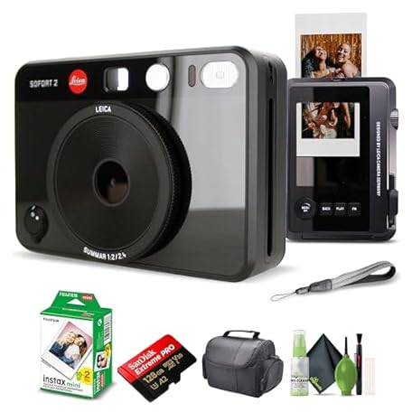 Leica Sofort 2 Hybrid Instant Photo Film and Digital Camera (Black) (19190) with LCD Display Bundle with Fujifilm Instant Film 20 Sheets + 128 GB Memory Card + Bag + Cleaning Kit