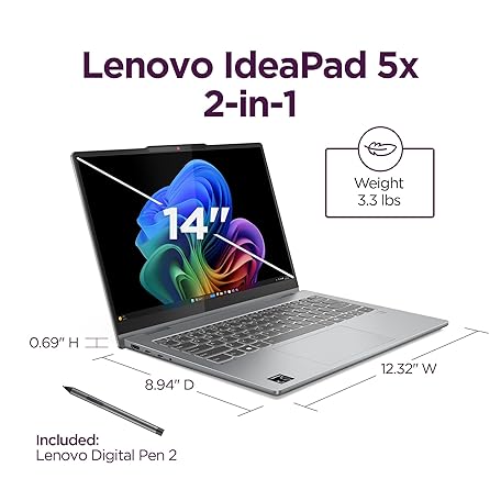 Thông tin sản phẩm Lenovo IdeaPad 5X 2-in-1 Copilot+ Extra-Long Battery Life 14" WUXGA FHD+ OLED Touch Display 16GB Memory 512GB Storage Snapdragon X Plus 8-core Processor Windows 11 Home, Pen Included, Luna Gray