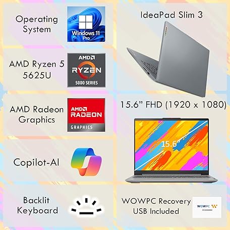 Thông tin sản phẩm Lenovo IdeaPad Slim 3 Business Laptop with Backlit Keyboard, 15.6" FHD IPS Display, AMD Ryzen 5 5625U (Outperforms i7-1355U), 16GB RAM, 1TB SSD, SD Card Reader, Windows 11 Pro, WOWPC Recovery USB