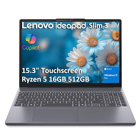 Lenovo IdeaPad Slim 3 Touchscreen Laptop (15.3" FHD+, AMD Ryzen 5 8540U ( Intel i7-1355U), 16GB RAM, 512GB SSD) for Business, Home, 1080p IR Webcam, Backlit, 14-Hr Battery Life, Wi-Fi 6, Win 11 Pro