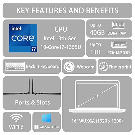 Lenovo ThinkPad E16 Business Laptop, 16" FHD+ Anti-Glare Display, Intel 13th Gen 10-Core i7-1355U, 40GB RAM, 1TB SSD, Fingerprint, Backlit Keyboard, Webcam, HDMI, Wi-Fi 6, Windows 11 Pro, Black