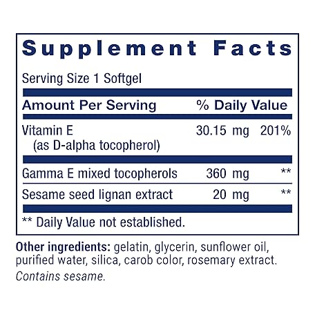 Thông tin sản phẩm Life Extension Gamma E Mixed Tocopherols, Healthy Aging, Vitamin E Supplement, Enhanced with Sesame lignans, Gluten-Free, Non-GMO, 60 softgels