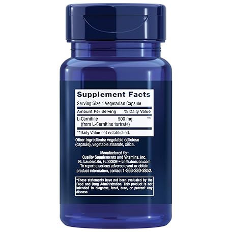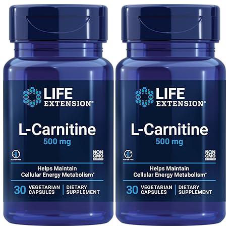 Life Extension L-Carnitine – 500 mg, Energy Supplement, Memory Supplement – Free Form Amino Acid, Nitric Oxide Support – Gluten-Free, Non-GMO, Vegetarian – Two Pack - 2 x 30 Capsules