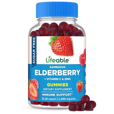 Lifeable Sugar Free Elderberry Gummies with Vitamin C and Zinc | Great Tasting Sambucus Elderberry Immune Support Supplement | Kosher, Vegan, Non GMO Black Elderberry for Adults | 60 Gummies