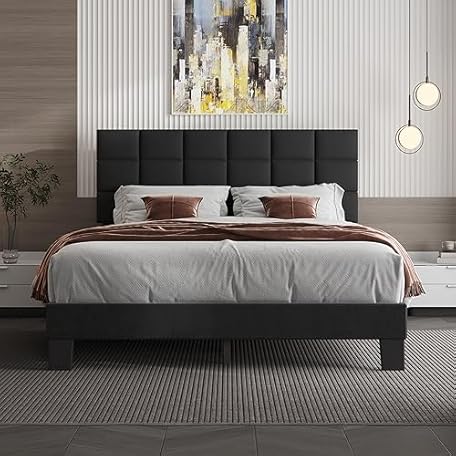 Lifezone Full Bed Frame with Headboard Upholstered Bed Frame with Linen Tufted Headboard,Wood Slats Support,No Boxing Needed,Heavy Duty Feet,Easy Assembly, Dark Grey