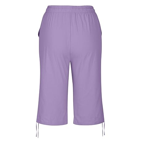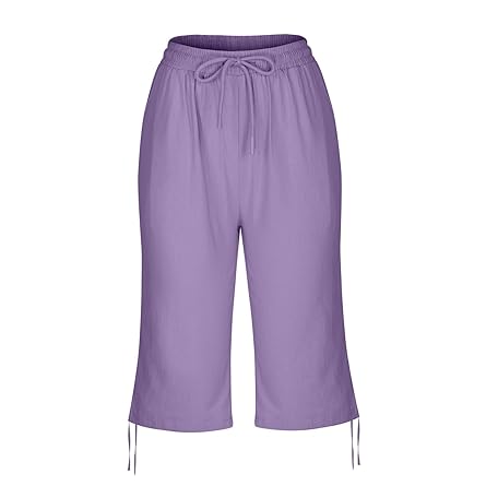 • Linen Shorts for Women Summer Knee Length Elastic Waist Capri Pants Casual Gym Drawstring Bermuda Shorts with Pockets