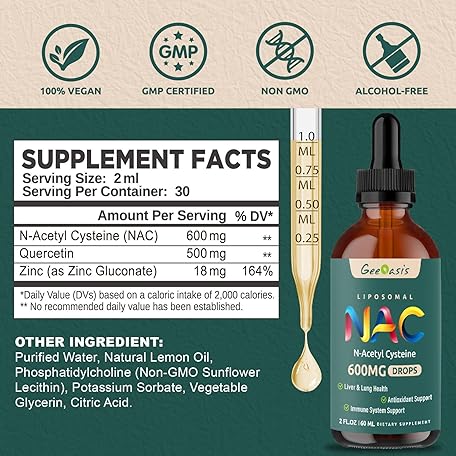 Thông tin sản phẩm Liposomal Liquid NAC Supplement N-Acetyl Cysteine Drops, N Acetyl Cysteine 600 mg with Quercetin & Zinc for Adults & Kids, Liver & Lung Support, Antioxidant, Immune & Skin Health, 2 Fl Oz