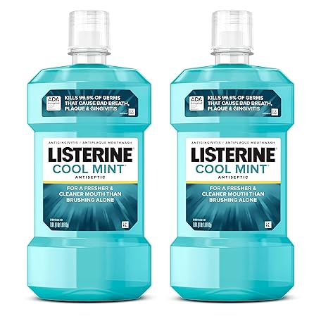 Sản phẩm Listerine Cool Mint Antiseptic Mouthwash, Kills 99.9% of Germs That Cause Bad Breath, Plaque & Gingivitis, ADA Accepted, Clinically Proven, Cool Mint Flavor, for Adults, 1L Bottles, 2 Pack đang được bán với giá ưu đãi là $15.2382 tại nước Mỹ.